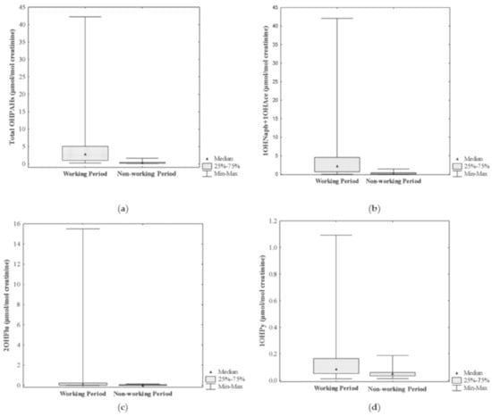 Urinary concentrations of ∑OHPAHs were significantly higher during a regular working period comparatively with the following resting days (ca. 9 times higher: 2.77 (0.213–42.3) versus 0.298 (0.097–1.66) µmol/mol creatinine, respectively; p ≤ 0.001) (Figure 2a). Moreover, levels of individuals compounds were also significantly higher during the regular working hours comparatively with the nonworking period (1OHNaph + 1OHAce: 2.23 (0.025–42.1) versus 0.098 (0.029–1.41) µmol/mol creatinine; 2OHFlu: 0.112 (8.49 × 10−5 − 15.5) versus 0.018 (1.24 × 10−4 − 0.133) µmol/mol creatinine; 1OHPy: 0.086 (0.011–1.09) versus 0.049 (0.013–0.188) µmol/mol creatinine; 1OHPhen: 0.073 (2.51 × 10−4 − 0.719) versus 0.031 (0.016–0.088) µmol/mol creatinine, respectively; p ≤ 0.001) (Figure 2b–e).