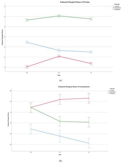 Estimated Marginal Means plots for (a) proteins, (b) carbohydrates; (c) fructose; (d) L*; (e) a*, and (f) b*.