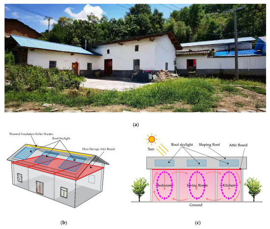 Affected by the monsoon climate in southern Shaanxi, the indoor environment of traditional houses is generally wet and cold in winter. The existing heating methods are mainly grouped into two types: the traditional heating method is mainly heating by burning charcoal, and the modern heating method is mainly local heating with small electrical appliances. These two heating methods only heat part of the indoor space, and the energy consumption is high. This study proposes a roof solar heat storage heating system, which adds a roof skylight to the roof of traditional houses and adds the HDPE heat storage and insulation material to the roof attic plate, so that the polyethylene material on the attic plate can absorb the heat radiation of the sun and improve the overall indoor temperature by means of the heat transfer principle of heat convection and heat radiation. This heating system is different from the previous solar glass roof heating system. The roof attic plate is made of the solar panel heat storage material—high-density polyethylene (HDPE). This material has been proved to be a promising phase change material with many advantages, such as small volume change, high thermal efficiency, no corrosion, light undercooling, and so on [34,35]. For the purpose of increasing the efficiency of absorbing solar heat radiation, the traditional opaque roof in southern Shaanxi is transformed into a push-pull transparent glass roof. In winter, the thermal insulation roller shutter is closed to ensure that the solar panel heat storage material absorbs more heat radiation from solar radiation. In summer, opening the thermal insulation roller shutter can effectively reduce the indoor temperature. The whole heating process completely depends on passive solar heating without any power equipment support. It is a complete passive heating technology.