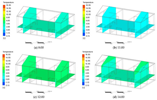 At 13:00, the temperature of the east room was 5.5 °C, the temperature of the middle room was 5.8 °C, and the temperature of the west room was 6.2 °C (Figure 10a). At 14:00, the temperature of the east room was 5.8 °C, the temperature of the middle room was 6.2 °C, and the temperature of the west room was 6.7 °C (Figure 10b). At 15:00, the temperature of the east room was 7.7 °C, the temperature of the middle room was 7.8 °C, and the temperature of the west room was 8.1 °C (Figure 10c). At 16:00, the temperature of the east room was 7.9 °C, the temperature of the middle room was 8.0 °C, and the temperature of the west room was 8.2 °C (Figure 10d). At 17:00, the temperature of the east room was 7.3 °C, the temperature of the middle room was 7.4 °C, and the temperature of the west room was 7.6 °C (Figure 10e). At 17:30, the temperature of the east room was 6.5 °C, the temperature of the middle room was 6.7 °C, and the temperature of the west room was 6.7 °C (Figure 10f). At 18:00, the temperature of the east room was 5.1 °C, the temperature of the middle room was 5.4 °C, and the temperature of the west room was 5.3 °C (Figure 10g). At 19:00, the temperature of the east room was 4.2 °C, the temperature of the middle room was 4.3 °C, and the temperature of the west room was 4.5 °C (Figure 10h). The indoor temperature remained stable at 3.1 °C from 19:30 to 8:00 the next morning.