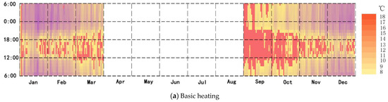 Taking 18 °C as the limit of indoor thermal comfort, we calculated the time when the new system produced temperatures below 18 °C. Under the condition of basic heating, the time when the temperature of the building was lower than 18 °C was 5019 h (Figure 13a), accounting for 56.98% of the year. When the solar energy system was adopted, the time when the interior temperature was lower than 18 °C is 4006 h without solar radiation, accounting for 46.36% of the year (Figure 13b). The time when the temperature was lower than 18 °C all year was 3763 h with solar radiation, accounting for 43.55% of the year (Figure 13c).