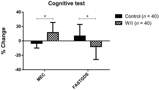 Figure 2 represents the change percentage in the cognitive variables of both groups. Statistically significant differences were observed in the change percentage on the MCE and Fast-GDS during the study, depending on the group (p < 0.05). Specifically, in the WII group the change percentage on the MCE and Fast-GDS was 11.64 ± 13.94%, and 7.88 ± 17.84%, respectively, while in the control group it was −3.37 ± 6.53% and 6.83 ± 16.05%.