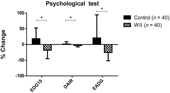 Statistically significant differences were observed in the change percentage of the psychological variables during the study, depending on the group. Specifically, when compared with the control group, the change percentage was higher and negative in the Wii group on the EDG-15 (−18.01 ± 27.11% versus 18.28 ± 34.25%), 2.00 ± 19.77%), DAIR (−3.12 ± 4.59% versus 1.43 ± 7.25%), and EADG (−24.17 ± 26.53% versus 20.75 ± 73.68%) (Figure 3).