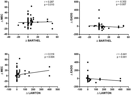The correlations between the cognitive status (MCE) and psychological status (EADG), and performance on basic and instrumental ADLs (Lawton and Brody index) are shown in Figure 4. A statistically significant and positive correlation was observed between the Δ MCE and the Δ Barthel index (r = 0.287; p = 0.010) and the Δ Lawton and Brody index (r = 0.319; p = 0.004). On the contrary, a statistically significant and negative correlation was obtained between the Δ EADG and the Δ Barthel index (r = −0.302; p = 0.007) and the Δ Lawton and Brody index (r = −0.441; p < 0.001).