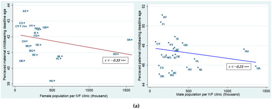 The bivariate relationship between countries’ population per IVF clinics and maternal childbearing (r = −0.33, p < 0.001) and paternal childbearing (r = −0.23, p < 0.001) ages showed both showed significant negative relationships, which indicate that people perceived significantly higher maternal and paternal deadline ages when there were more IVF clinics available in a country (see Figure 1).