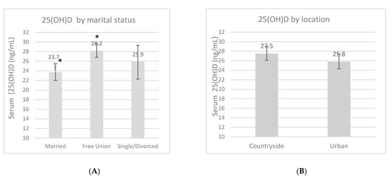 Women living in rural areas appear to have higher sunlight exposure and higher 25(OH)D concentrations, which may result in a lower risk for many adverse perinatal outcomes. There are no previous studies in Mexico that compare vitamin D status in pregnant women living in urban or rural zones, and there are only a few studies globally. In countries such as Vietnam, Pakistan, and Mongolia, higher 25(OH)D concentrations have been reported in pregnant women living in rural areas [16,17,18]. In a study comparing women from three different areas of Mongolia (one urban, two rural) and women from Boston, significantly lower 25(OH)D concentrations were observed in Mongolian women. However, higher concentrations were observed in women from the two rural provinces of Mongolia (15.2 and 15.3 ng/mL) compared to women in the capital (urban) (13.2 ng/mL) [18]. In another study done on non-pregnant and pregnant women in Vietnam, those living in a rural province had significantly higher 25(OH)D concentrations than women from an urban city (34 ng/mL vs. 31.2 ng/mL, respectively) [17].