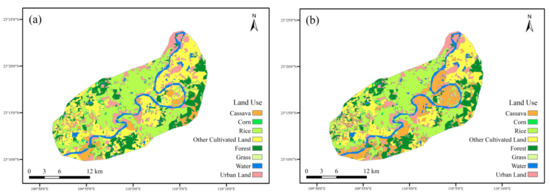 The land-use types of the Yujiang River Basin included cassava, corn, rice, other cultivated land, forest, water area, and construction land. The interpretation results of the two terms are displayed in Figure 4.