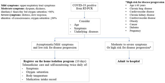 This home isolation program was initiated on 29 October 2021, for the provision of health care for patients with confirmed COVID-19 with mild symptoms at first presentation. The patients who were eligible for enrolment onto this program needed to meet the initial criteria. Once registered onto the program, patients had to follow the instruction for self-management at home. The initial criteria and instruction for self-management are detailed in Appendix A and Appendix B During the 10-day home isolation period, patients were able to contact the health care personnel of the home isolation team via text messages (chat) through the online platform with no limitation on frequency of contact. All meals were delivered to the place of isolation of the patient until discharge. The management plan is shown in Figure 1.