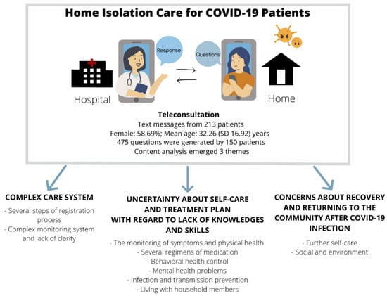As there were strict limits on contact between health professionals and patients during the COVID-19 pandemic, telemedicine increased in importance with regard to improving the provision of health care and became the preferred method of care. This study aims to determine the topics of concern expressed by individuals with COVID-19 receiving care at home via teleconsultation. The qualitative study was conducted using secondary data of chat messages from 213 COVID-19 patients who had consented to online consultation with the health care team. The messages were sent during the home isolation period, which was between 29th October and 20th December 2021. Thematic analysis was used to analyze the data. All patients had consented to the use of their data. A small majority of the patients were female (58.69%). The average age was 32.26 ± 16.92 years. A total of 475 questions were generated by 150 patients during the isolation period. Nearly thirty percent (29.58%) never asked any questions. From the analysis, the questions could be divided into three themes including: (1) complex care system; (2) uncertainty about self-care and treatment plan with regard to lack of knowledges and skills; and (3) concern about recovery and returning to the community after COVID-19 infection. In conclusion, there were enquiries about many aspects of medical care during home isolation, detailed answers from professionals were useful for the self-care of patients and to provide guidance for their future health behavior. The importance of the service being user friendly and accessible to all became increasingly evident.
