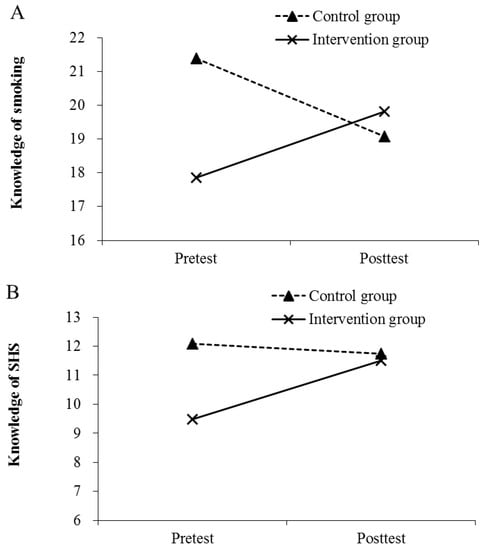Figure 2 summarizes the changes in the mean scores of the three outcome measures (i.e., knowledge of smoking, knowledge of SHS exposure, and attitudes toward SHS avoidance), exhibiting improvement as a result of the intervention program.