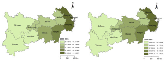 Based on Equations (2) and (3), this paper calculated the average CIGTFEE of YREB in the four periods from 2003 to 2018 and used Geoda to evaluate the Moran’s index. The global auto-correlation results are given in Table 3.