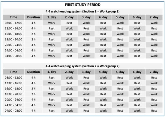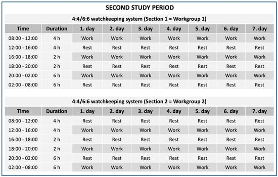 The onboard measurements took place on a Finnish Defence Forces’ (FDF) Navy missile patrol boat and consisted of two separate study periods. The measurements lasted 2 weeks in total: 1 week (7 days and 6 nights) with a 4:4 watchkeeping system and another week (7 days and 6 nights) with a 4:4/6:6 watchkeeping system. The structures of the watchkeeping systems are shown in Figure 1 and Figure 2. Both watchkeeping systems consisted of two watch sections and, therefore, required two working groups to maintain the systems. When one working group was working, the second working group was resting and the other way around. This meant that both working groups were working a total of 12 h each day. The 4:4 watchkeeping system contained two daily 2 h half-watches (16:00–18:00 h and 18:00–20:00 h) and had a rotating watch schedule. Because of the rotating watch schedule, the working hours during this 4:4 watchkeeping system were completely irregular between the consecutive days. The 4:4/6:6 watchkeeping system contained the same two daily half-watches (16:00–18:00 h and 18:00–20:00 h) and was a fixed system. Because of the fixed watch schedule, the working periods were at the same time each day. Most of the participants were the same in both study periods, and there were 16 days between the periods to make sure that the participants had sufficient time to recover from the first study week.