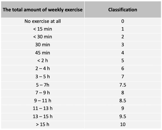 Age and prior time in the naval service were defined in years. The level of subjective physical activity was defined as a numeric value from 0 to 10 according to the physical activity classification shown in Figure 3. Regarding the body composition, the body mass index (BMI), body fat percentage (BFP), skeletal muscle mass (SMM) and fat mass (FATM) were measured in the morning after 10 h of fasting using a segmental multifrequency bioimpedance analysis (InBody 720, Biospace, Seoul, South Korea). The waist circumference (WC) of the participants was also measured.