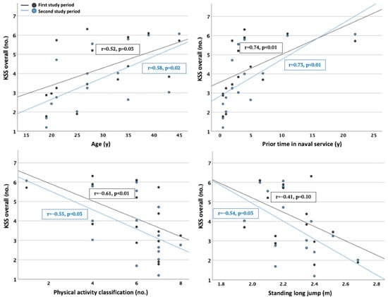 The participants’ age and prior time in naval service had the most distinct positive associations with the amount of sleepiness and fatigue and the stress responses during the study weeks. In contrast, their physical activity classification and standing long jump had negative associations. Regarding sleepiness and fatigue, the correlations between these individual characteristics and KSS scores overall are displayed in Figure 4. Significant positive associations with KSS scores overall during both study weeks were observed regarding age (1. r = 0.52, p = 0.03 and 2. r = 0.58, p = 0.02) and prior time in the naval service (1. r = 0.74, p < 0.01 and 2. r = 0.73, p < 0.01), whereas significant negative associations with KSS scores overall were observed regarding physical activity (1. r = −0.61, p < 0.01 and 2. r = −0.55, p = 0.03) and standing long jump (2. r = −0.54, p = 0.03).