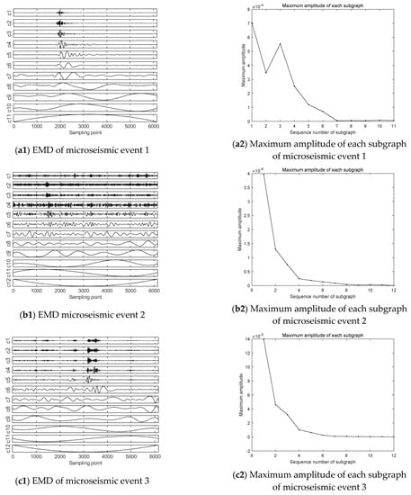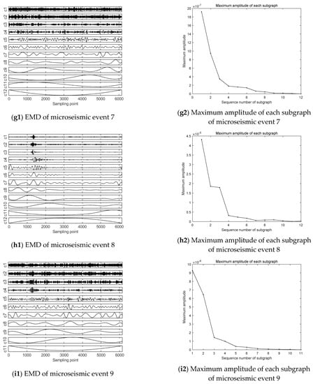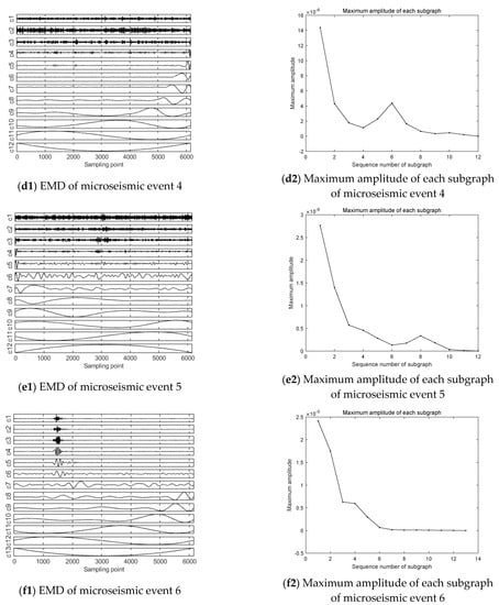 In addition to the difference in maximum amplitude in the subgraph, the IMF components of each microseismic event were compared in the EMD plots, it can be seen that among the IMF components from 1 to 7, the waveform in event 1 is relatively gentle with small amplitude in the early sampling period, and the amplitude increases between 1800 and 4000 sampling points in the middle period, and obvious waveform appears. After 4000 sampling points, the waveform flattens out again. However, for the 8–12 IMF components, the complete waveform start–end period was not recorded in these components during the sampling time, and the difference was relatively rare in the sampling time due to the low frequency, so this paper will not discuss it.