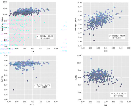 In Equation (5), xi and yi are the variables, and are the means of variables xi and yi, and r is the correlation coefficient. The maximum correlation coefficient is 1. The closer the absolute value of the correlation coefficient is to 1, the stronger the correlation between the variables. Our study will measure the correlation coefficient between carbon emissions per capita and its influencing variables using correlation coefficients, and visually express the relationship between them by means of scatter plots.