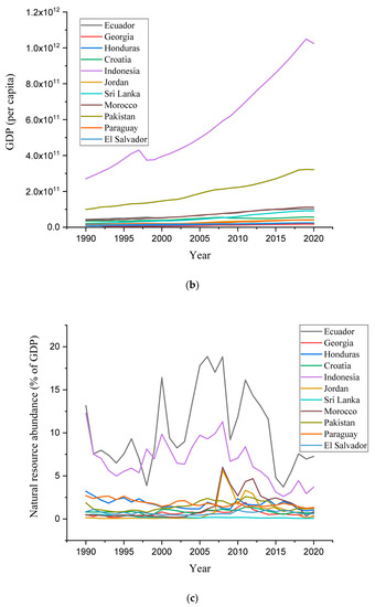 Several studies have shown that more natural resources are important to impact economic growth. For example, Auty [15] found that rich natural resources slow down the pace of economic growth. However, Bravo-Ortega and de Gregorio [16], observed that natural resources increase income but have a negative effect on the national growth rate. Shahbaz et al. [17], validated the natural resource curse hypothesis. Brunnschweiler and Bulte [18], described the difference between natural resource dependence and abundance. They presented that natural resource abundance increases economic growth whereas gross domestic product (GDP) is unaffected by natural resource dependence. Balsalobre-Lorente et al. [7], argued that the abundance of natural resources reduces CO2 emissions in European countries. They argued that countries with ample natural resources utilize them instead of fossil fuels and maintain economic growth. However, Danish et al. [19], presented contradictory evidence for Brazil, Russia, India, China and South Africa (the BRICS nations).