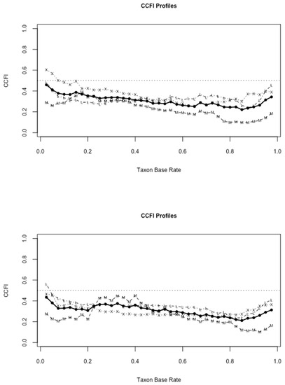 Next, taxometric model fitting requires the specification of a plausible taxon base rate (see [86]) in order to compute the desired CCFI values. As a recently developed alternative to subjectively determining this base rate (e.g., by consulting previous literature, guestimating, etc.) Ruscio et al. [88] developed a method of creating CCFI profiles, in which taxometric analyses were performed iteratively across a range of specified base-rates. The CCFI profile method, though computationally more intensive, is advantageous in that it provides a reliable means of determining whether the underlying measurement model is dimensional or categorical, and, when in fact categorical, CCFI profiles provide the most accurate estimate of the true underlying base rate. We therefore used the CCFI profile method, evaluating of CCFI values (and their average) across the broadest range of taxon base rates (2.5% to 97.5%).