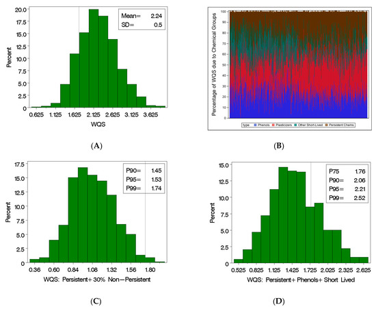 Other studies have focused on the “what if” question with g methods using single chemical exposure levels. For example, Garcia et al. [26] focused on air pollutant interventions as measured by NO2 or PM2.5 and childhood asthma incidence. They asked, “How would the incidence rate of asthma in our participants change if we could modify their exposure to regional NO2 (or PM2.5)?” Instead of focusing on beta coefficients relating conditional incidence rate ratios for a one-unit change in air pollution exposure, they presented a population intervention measure that estimates asthma incidence rates had exposure been, for example, no higher than 20 ppb NO2. Their motivation, similar to ours, is to move beyond the report of point estimates to potentially improve the translation of the study to policymakers. That is, instead of only interpreting the results of the study in terms of the significance of a beta coefficient, the g methods which use an index to represent multi-dimensional components (e.g., environmental chemicals for the WQS index and dozens of nutrients for the MNI) allow researchers and decision makers to take an additional step using the metric to provide targets for changes. We considered several scenarios for reducing the WQS index to a target level—i.e., an overall cut to all non-persistent chemicals and cuts based on chemical classes. Persistent chemicals such as PFAS (called the “forever chemicals”) should also be considered for reduction strategies; however, their remediation is often ineffective but is attracting intensive research seeking effective technologies for their removal from the environment [27,28]. The illustration indicated that a severe cut is necessary to reduce environmental exposures to the “what if” target value. A cut of 70% of the non-persistent chemicals would no doubt be difficult to achieve, and removing all plasticizers alone is not enough to reach the target value. Use of a weighted index in such counterfactuals may complement current strategies for risk management which generally focus on single chemicals, even though risk increases when mixtures are considered. Further, chemical combinations are generally considered based on convenient groupings (e.g., assuming additivity) and not based on human exposure patterns or unintentional mixtures [29].