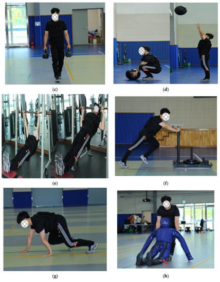 The pulling motion represents a typical movement that sees practical usage in firefighting and is also mainly used in the CPAT’s forcible entry, ceiling breach and pull [7]. Our study adopted alternative tests such as the medicine ball throw, inverted row, sledge push, and others that activate the same muscle groups [9]. The height of the medicine ball throw was determined considering the weight of thrust force and its potential energy, while the weight of sledge in the sledge push considered a water shooting pressure of 2.5 MPA (25 kg) exerted from the hose [6]. The modified firefighter physical fitness test proposed by our study is illustrated in Figure 1.