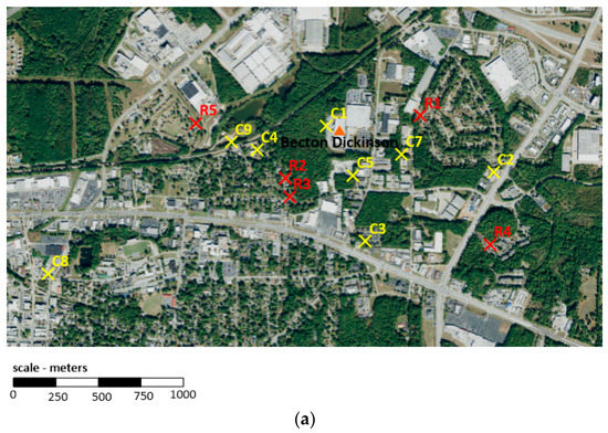Under the direction of the Georgia Department of Natural Resources’ Environmental Protection Division (EPD) (Atlanta, USA), ambient air samples have been collected at selected locations in the vicinity of three sterilization facilities in Georgia (Becton Dickinson in Covington (as opposed to Madison, which is the location of another Becton Dickinson facility with corresponding modeling data only and later described in this paper), Sterigenics, and Sterilization Services) to characterize ambient EO concentrations in the vicinity of the facility [14,15,16,17,18] (see Table 1 and Figure 1a–c). EO concentrations for these samples were determined in accordance with the U.S. EPA methodology. All air samples were collected at multiple sampling sites within ~5500 m of these three facilities during multiple days per month and across all four seasons in 2019–2021 (except for Sterilization Services, which was 2020–2021). Background air samples were also collected in Georgia in both South Dekalb and General Coffee State Park. Given that these background air samples were collected at substantial distances from these facilities (>22,500 m) and in non-industrial settings, they are more likely representative of “state” or “regional” rather than “local” background EO concentrations. Six background air samples (<1% of the samples) with unusually high concentrations of EO (~1.5–5.4 ppb) were identified as potentially anomalous and removed by the authors prior to data analysis. Our prior published analysis [8] demonstrates that background EO concentrations in ambient air are generally no greater than ~1 ppb, which is the criterion that we used in the current paper for identifying outlying values. This is also generally consistent with the maximum concentration of EO in ambient air that has been reported by the U.S. EPA [10]. Approximately 3% of the samples were reported by the Georgia EPD as non-detect (ND). The DLs noted in the corresponding laboratory analytical reports were ~0.025–0.029 ppb.