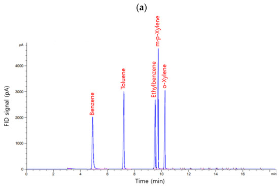 (a) Chromatogram of the standard BTEX gas and (b) calibration curves for the BTEX gas ( = 100 ppb, Q = 150 mL/min, t = 5, 10, 15, 20, and 25 min).