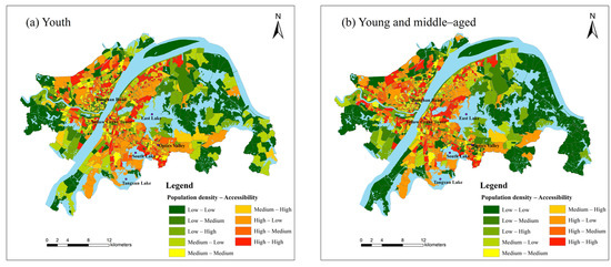 Residents’ demand for park green space will decrease with the increase of distance [54]. This supply–demand relationship shows a normal distribution with the change of distance, which is consistent with the performance of the Gaussian function [55]. Therefore, the RG2SFCA method is chosen to conduct the following research in this paper. We use the Natural Breaks (Jenks) to divide the accessibility, population density and housing prices into three levels: low, medium and high. Then the population density, housing prices and accessibility areas are overlapped respectively (Figure 5). For more visual display, we take the low-low, medium-medium and high-high levels as “matching”, and the rest as “non–matching” (Figure 6). As shown in Figure 5, the accessibility of park green space for youth and young and middle-aged people has similar distribution characteristics in a circle, with low accessibility in the outer circle. The matching degree of supply and demand in each circle layer is heterogeneous. The population density of the two groups matches the accessibility in the Jianghan Road Commercial District, the Yellow Crane Tower Scenic Area, and the north side community of Tangxun Lake. In the northwest of South Lake and East Lake, the Optics Valley Commercial District has a low degree of matching, which shows characteristics of “high population density–low accessibility”. There are more communities with dislocation of supply and demand, which means that the efficiency of park green space is inequitable. The region gathers colleges including Wuhan University of Technology and Wuhan University of Science and Technology, with a large number of young and middle–aged teachers and students, and is densely populated. As an important transportation hub and commercial center in Wuhan, the Optics Valley Commercial District is surrounded by many well-known universities and scientific research resources. The age structure tends to be young and middle–aged and the supporting park green space resources are few. The population density of the elderly in the Hankou Beach, Heping Park group and the west side of the East Lake have a higher matching degree with accessibility. Areas with low population density and high accessibility are occasionally distributed in the southeast of East Lake, Huashan Avenue and the south of Hanyang District. These areas have resources such as Ma’anshan Forest Park and Huashan Ecological Green City.