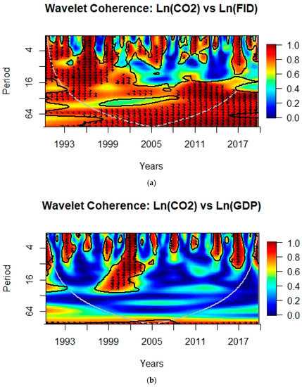 Figure 1a shows a high correlation (R2 = 0.9–1) of CO2e with financial institutional deepening at the period of scale 4–16 from 1993 to 1999. The arrows are in-phase indicating direct relationship between CO2e and financial institutional deepening from 1993 to 1997, which means that an increase in financial institutional deepening led to increase in CO2e in G-10 countries, whereas from 2009 to 2015, in the frequency band of 16–32, the rightward-down arrows show CO2e is leading the financial institutional deepening. Figure 1b, from 1999 to 2004 and 2013 to 2015, with time-period scales 0–28 and 0–8, respectively, show a high positive correlation between CO2e and GDP. A negative correlation between CO2e and GDP is observed for the 0–11 and 0–8 quarterly period from 1992 to 1994 and 2016 to 2018, respectively. Khalfaoui et al. [67] found bidirectional causality between CO2e and GDP using wavelet coherence scales in G-7 countries.