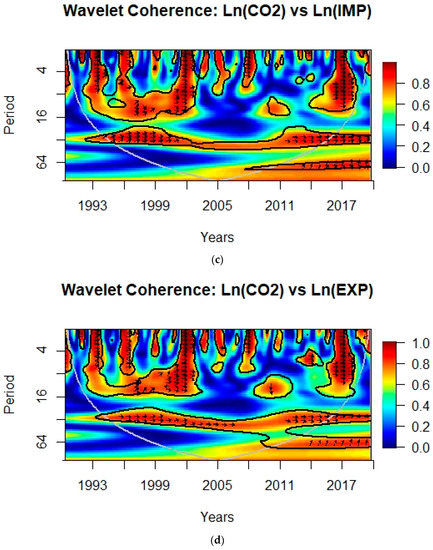 In Figure 1c, between the 0–16 period scale, from the years 1993 to1994, 2001 to 2003, and 2016 to 2018, a strong correlation with the arrows pointing to the right mostly are exhibited, indicating that the CO2 emissions are in-phase with import. From 1995 to 2001 and 2011 to 2015, a strong positive correlation between CO2e and import was also exhibited, around 32 periods of quarterly time scales. A strong positive in-phase correlation is observed between CO2e and export in the years 1992 to 1994, 1995 to 1997, 2001 to 2003, 2007 to 2009 and 2016 to 2018 between 0–16 periods of quarterly scales, and at the quarterly period of 28–48 in the years 1995 to 2006 and 2012 to 2015. Mutascu et al. [97] studied the relationship between CO2e and trade openness in the European Union using the wavelet coherence approach and found that CO2e was positively related to imports and exports from 2006 to 2010 and 2007 to 2008, respectively.