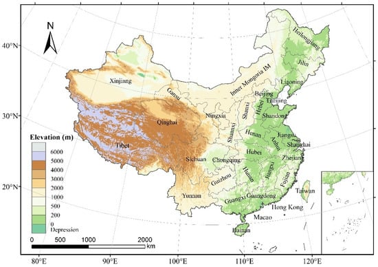 China is located in the southeast of Eurasia, with geographic coordinates ranging from 30°52′ to 53°31′ N latitude and 73°40′ to 135°05′ E longitude (Figure 1). The land area of China is about 9.6 million km2, and the water area of the inland and border seas are approximately 4.7 million km2. The land and sea boundary reaches 40,000 km, with a vast territory, complex landforms, and diverse climates. Natural resources are abundantly available. Urbanization has been accelerating since the reform and opening up, leading to significant changes in China’s ecological environment [,].