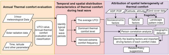 Geographic detectors are used to detect spatial heterogeneity and reveal the driving force behind them. The core idea is based on the assumption that if an independent variable (X) has an important influence on a dependent variable (UTCI), the spatial distribution of X and UTCI should be similar.