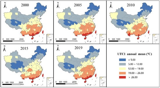 The average UTCI values of each city in the years 2000, 2005, 2010, 2015, and 2019 are statistically and visually displayed in Figure 3. The UTCI mean distribution pattern of the five years had the same general trend, showing a trend of high in the southeast and low in the northwest. The highest UTCI value was distributed in the southern part, whereas the lowest UTCI value was mainly distributed in the northeast and northwest of higher latitudes and in the southwest of Tibet at higher altitudes. In addition, the UTCI of the southern region of the Xinjiang Uygur Autonomous Region was significantly higher than that of the surrounding regions.