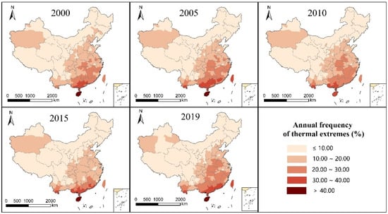 The spatial distribution pattern of the frequency of annual thermal extreme thermal comfort in each city showed an obvious general trend of high in the southeast and low in the northwest in all five years (Figure 4). The highest frequency (more than 40.01%) was distributed in Hainan Province, which has the lowest latitude and highest annual temperature. The second-highest frequency values (between 30.01 and 40.00%) were mainly distributed in South China and southern Southwest China, where the latitude is also lower and the average annual temperature is higher. Cities with frequencies between 20.01 and 30.00 were mainly distributed in the south and the middle and lower reaches of the Yangtze River. These areas had a high frequency of extreme thermal comfort throughout the year, so attention should be paid to improving the living environment.