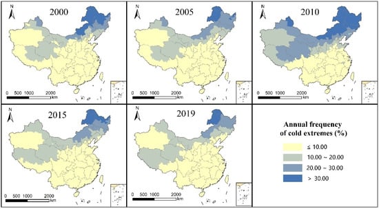 Annual frequency distribution of cold extremes in China from 2000 to 2020.