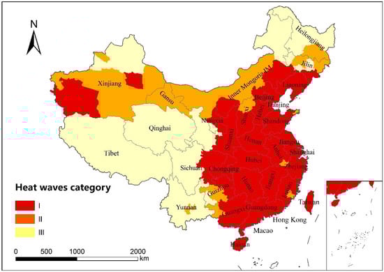 In the selected typical heat wave period, cities were classified according to temperature data into the following three categories: Class I cities were in the heat wave period, with five days exceeding 25 °C and at least three days exceeding 30 °C. The temperature of Class II cities was relatively high, but did not meet the standard of a heat wave period. All five days exceeded 25 °C, but fewer than three days exceeded 30 °C. The temperature of Class III cities was relatively low and did not exceed 25 °C for all five days. According to the classification results, 240 cities fully met the criteria of being in a heat wave period, mainly distributed in East China and the Xinjiang Uygur Autonomous Region in Northwest China. There were 31 cities with high temperatures that did not meet the criteria for heat waves, and the distribution was scattered, both in the south and north. There were 73 cities with low temperatures, mainly in the northern and southwestern regions (Figure 6).