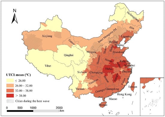 Superposition analysis of UTCI mean distribution and cities identified as being in heat wave period showed that cities identified as being in a heat wave period had higher UTCI mean values, and the UTCI mean values were generally above 32 °C (corresponding to the thermal comfort level of “hot” and “very hot”), indicating that the high distribution of UTCI values showed strong consistency with air temperature. However, the average value of cities identified as being in a heat wave period in the Xinjiang Uygur Autonomous Region, Inner Mongolia, and other regions was low, which may be because the recognition of the heat wave period only focused on the maximum temperature, whereas the UTCI average value was calculated multiple times.