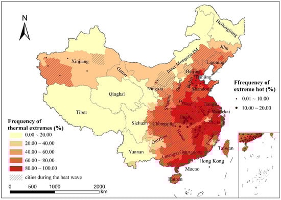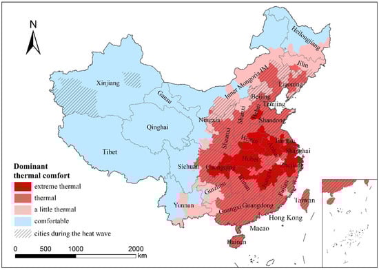 Distribution of dominant thermal comfort levels in different cities during the heat wave (shaded areas are cities during the heat wave).