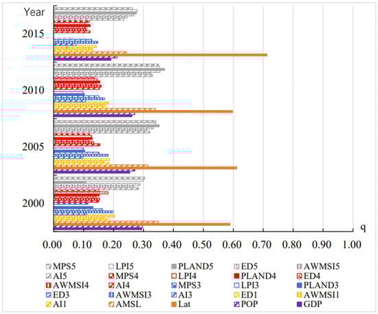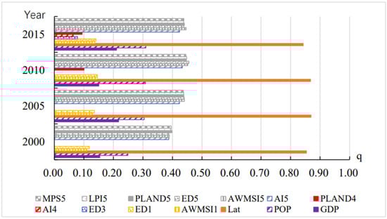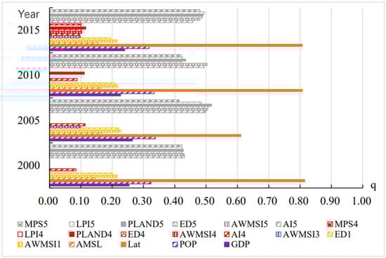 The Q statistics of annual UTCI mean drivers were obtained using geographic detectors (Figure 10). It was found that latitude (Lat) was the dominant factor in the annual UTCI mean for 2000, 2005, 2010, and 2015, and accounted for 60% and 80% of the annual UTCI mean. Second, the Q values of the six landscape pattern indices of the unused land could explain the UTCI average by more than 40%. Finally, the socioeconomic factors GDP and POP, natural factor elevation (AMSL), and landscape pattern indices AWMSI and ED of cultivated land type were explained with a power between 20% and 40%. The landscape pattern index of construction land type, especially the AI index, also showed explanatory power for each year.