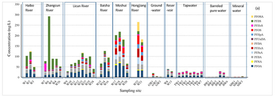 The concentrations of individual PFAS compounds at each sampling site in this study are provided in Table S4 in the Supplementary Information. Table 1 presents the statistics on the analytical results for the PFASs in the water samples from the six rivers, the drinking water sources, and drinking waters in Qingdao. Of the eighteen PFASs monitored in the river waters, twelve were detected, including eight perfluorinated carboxylic acids (PFCAs), three perfluoroalkyl sulfonates (PFSAs), and PFOSA. The detection rates of nine compounds (PFBA, PFPeA, PFHxA, PFHpA, PFOA, PFDA, PFOS, PFHxS, and PFBS) were 100%. The detection rates of PFNA, PFUnDA, and PFOSA were 96.3%, 66.7%, and 33.3%, respectively. Most of the targeted long-chain (C10–C18) PFASs (i.e., PFDoDA, PFTrDA, PFTeDA, PFHxDA, PFOcDA, and PFDS) were not detected in all the samples.