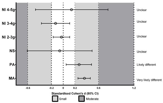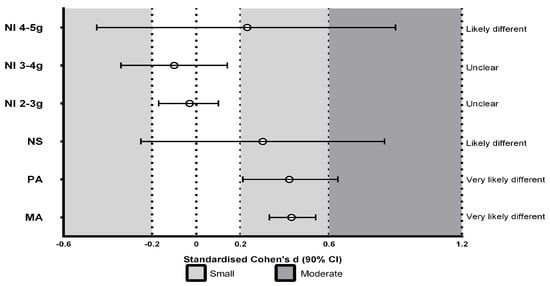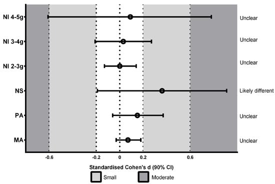 Figure 2, Figure 3 and Figure 4 represent the effects of surface type on accelerometry-derived parameters: synthetic track compared to concrete (Figure 2), grass compared to concrete (Figure 3), and synthetic track compared to grass (Figure 4). The results reveal that concrete surfaces showed a greater PA and MA than other surfaces; small differences in PA were found from the synthetic track: SD 0.42 (0.21, 0.64) and grass: SD 0.27 (0.05, 0.48). Similarly, concrete presented small differences in MA from the synthetic track: SD 0.43 (0.33, 0.54) and grass: SD 0.36 (0.25, 0.46). Greater NS values were observed for the synthetic track; small differences from concrete (SD 0.30 (−0.25, 0.85)) were shown, as well as grass: SD 0.36 (−0.19, 0.91). Trivial differences were observed between concrete and grass. The NI values of 2 to <3 g and 3 to <4 g showed no significant differences between surfaces. The NI of 4 to <5 g of the magnitude of acceleration (which was greater for concrete) showed small differences between the synthetic track and concrete: SD 0.23 (−0.45, 0.9).
