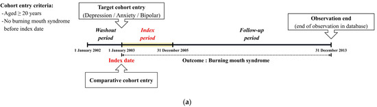 A brief description of the study design is presented in Figure 1a. This study was designed as a retrospective cohort using healthcare claim data. Thus, we set the washout period, index period, and follow-up period, respectively. Specifically, we conducted a washout period of one year (2002) to remove the possibility of diagnosis for BMS prior to depression, anxiety, and bipolar diagnosis. In this study, we included patients who were diagnosed with depression (F32), anxiety (F40, F41), or bipolar disorder (F31) and whose diagnostic codes were available for the index period. Moreover, we excluded patients (1) aged under 20 years, (2) who died during the index period, or (3) diagnosed with BMS (K14.6) before the diagnosis of depression, anxiety, or bipolar disorder. Additionally, we only selected the diagnostic code for BMS assigned by otorhinolaryngologists to enhance the diagnostic accuracy. Moreover, to eliminate the possibility of including patients who developed BMS before being diagnosed with depression, anxiety, or bipolar disorder, we set the washout period before the index period. Thus, we excluded patients identified in the year 2002 in this database. Then, we selected matched individuals for the comparison group from the remaining cohort registered in the database, namely four participants without cancer for each depression, anxiety, or bipolar patient (Figure 1b).