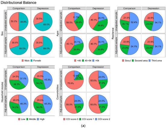 Age, sex, residence, household income, and comorbidities were considered independent variables. Thus, we controlled for these variables between the two groups in the main analysis, using propensity score matching. Specifically, we obtained information on the comorbidities of each individual and categorized the comorbidities using the Charlson comorbidity index (CCI). It is well-known that comorbidities could influence the development of BMS. Thus, to accurately investigate the effect of affective disorders on the risk of BMS, we controlled for comorbidities using CCI, which is widely used in claims data studies. The CCI is a weighted index used for predicting the risk of death within 1 year of hospitalization for patients with specific comorbid conditions (overall, 19 conditions were included in the index). All independent variables were classified as follows: age (<45, 45–64, >64 years), sex (male and female), residence (Seoul, the largest metropolitan region in South Korea; second area: other metropolitan cities in South Korea; and third area: small cities and rural areas), household income (low: ≤30%, middle: 30.1–69.9%, and high: ≥70% of the median), and comorbidity statuses (CCI: 0, 1, ≥2). A BMS event was the primary endpoint during the follow-up period, and if patients had no events until the final period of this database, we censored this time point (Table 1).