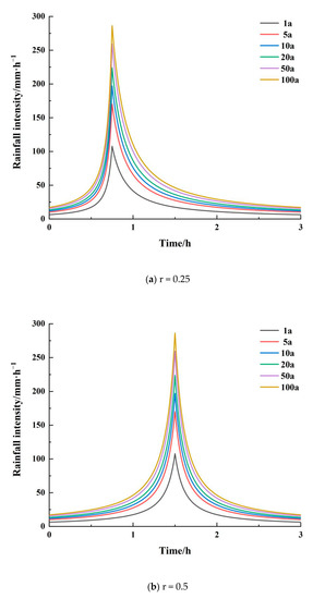 The Chicago rain pattern method is also known as the Keifer and Chu method. The Chicago rain pattern model [20] is derived from the storm intensity equation, and the location of the rain peak (integrated rainfall coefficient r) is determined from statistics of previous years’ rainstorm events. The Chicago rain pattern is applicable to urban areas, and the design rainfall ephemeris of around 3 h is the most accurate. Using the Chicago rain pattern as the design rain pattern for this occasion, the parameters of the storm intensity formula are initially determined. Rain intensity of the rising section (pre-peak) and falling section (post-peak) is then calculated separately using the formulae listed below for certain minute moments, and the instantaneous rainfall process line is finally obtained.
