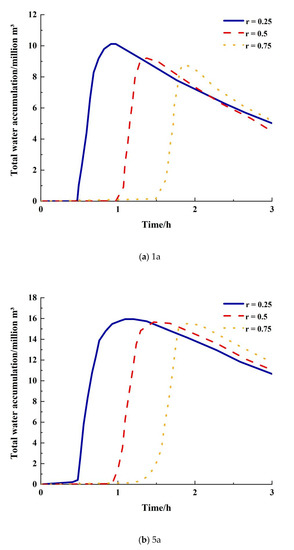 The waterlogging situation in the study area can be expressed in terms of the total amount of waterlogging. The total amount of water accumulated at each ponding point in the study area was superimposed to obtain the total amount of water accumulated in the area, and the process of calculating the total amount of water accumulated for each rainfall type at different return periods is shown in Figure 5. A comparison of the peak amounts of water accumulated at different return periods is shown in Table 3. As can be seen from Figure 5 and Table 3, when the return period is less than 20 years, the Chicago design rainstorm with a peak ratio of r = 0.25 is the most severe. For example, for a return period of 10 years, the total peak ponding volume for a peak ratio of r = 0.5 is 187,800 m3, a reduction of 1287 m3 from the peak ratio of r = 0.25; the total peak ponding volume for a peak ratio of r = 0.75 is 186,400 m3, a reduction of 1300 m3 from the peak ratio of r = 0.5. When the return period is higher than 20 years, a peak ratio of r = 0.75 produces a higher peak inundation than a single-peaked rainfall with r = 0.25. However, as the intensity of precipitation increases, the difference in peak inundation due to the difference in peak coefficients decreases. For example, for a 50-year return period, a rainfall with a peak ratio of r = 0.75 produces 4010 m3 more rainfall than a rainfall with r = 0.25. For a 100-year return period, a peak ratio of r = 0.75 provides 2962 m3 more rainfall than a peak ratio of r = 0.25.