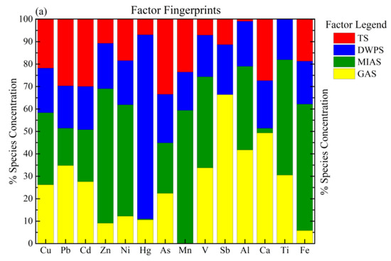 Factor profiles exhibiting the metal concentration percentages acquired from the PMF model via various origins in JDY (a) and HH (b) peatlands. TS represents traffic sources; DWPS: domestic waste pollution source; MIAS: mining industry and agricultural activities; GBS: geological background source; IATCS: industrial-agricultural-transportation complex source; ADS: atmospheric deposition source.