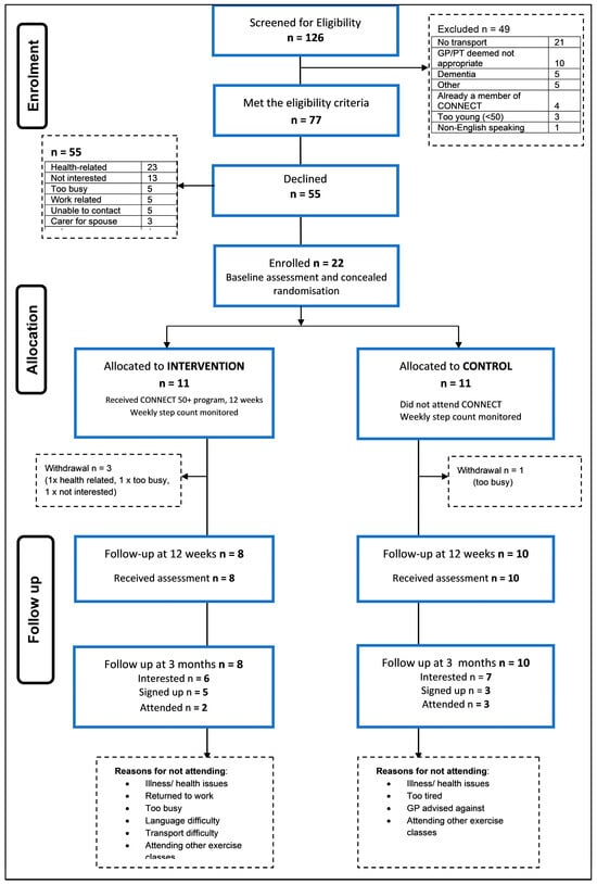 The CONNECT 50+ Program was based on the CONNECT 60+ program [] and was delivered in addition to usual care. CONNECT 50+ aimed to address physical, social, occupational, spiritual, intellectual, environmental, and psychological domains of wellness []. The program comprised an evidence-based strength and balance exercise class, supervised by a qualified, trained instructor, with two 45 min sessions a week over twelve weeks. Based on their personal interests, participants also completed a weekly wellness activity selected from a schedule of activities offered at the hub. Available activities included Tai Chi, Pilates, meditation, chair yoga, dancing, creative writing, art, choir, and book club. Each participant received a workbook (Healthy Aging for Midlife and Beyond, (see Supplementary File S2) that outlined the seven domains of wellness (physical, social, intellectual, emotional, environmental, vocational, and spiritual) [], self-management of health, principles and benefits of healthy aging and wellness, and cues to action. Intervention group participants were informed that they could undertake a free 3-month program at the community hub at the conclusion of the 12 weeks of the trial. They also received a Fitbit™ (Fitbit™ Inspire 2) with a free, publicly available app designed to log physical activity (daily step count) via a website or smartphone app (android and iOS compatible). Their step count was monitored over the 12-week trial period by a weekly telephone call from the blinded outcome assessor. The assessor asked participants to read the weekly step count from their phone and recorded the observation in the online database. If the participant did not have a smart phone or access to the internet via a home email, a pedometer (LA Gear or iVOLE) was used. Participants were instructed in its use and the same monitoring procedure was conducted.