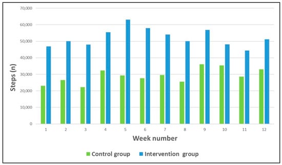 The mean weekly step count (physical activity) per week for both groups is presented in Figure 2. The intervention group demonstrated a significantly increased weekly step count compared to the control group (intervention group = mean steps 53,112.8 (±16,917.3) vs. control group = mean steps 28,855.8 (±16,312.2), p = 0.01). The intervention group completed an average of 568,000 (±206,953.7) total steps in 12 weeks compared to the control group who completed an average of 345,855 (±196,430) total steps (p = 0.03).
