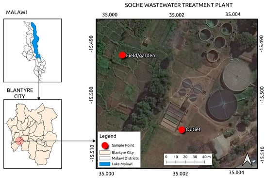 This study was conducted in southern Malawi, Blantyre City, at the Soche WWTP (Figure 1). Soche WWTP is the oldest treatment plant in the country, which was built in the 1950s and extended in the 1970s to its current design flow of 4100 m3/day []. It is a conventional biological filter plant serving a population of over 40,000, the city’s main hospital and a few small industries such as car dealing, clothing making, and food processing. It is also the main tanker reception center for latrine and septic tank emptying []. Treated effluent from the plant is often used for irrigation by local farmers in nearby gardens. No inorganic or organic fertilizers were applied to the vegetable plots during cultivation.