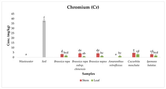 Chromium concentration in samples. Different lowercase letters above the bars indicate statistically significant differences among sample types (p < 0.05, Duncan’s Multiple Range Test).