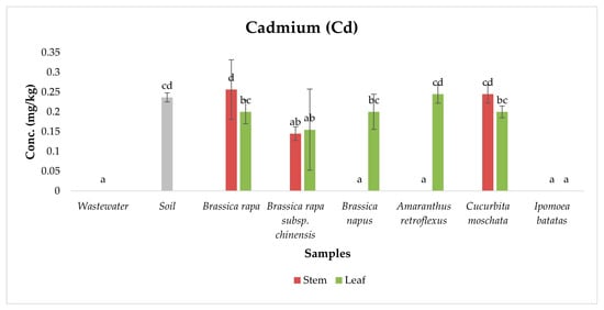 Concentration of Cadmium in samples. Different lowercase letters above the bars indicate statistically significant differences among sample types (p < 0.05, Duncan’s Multiple Range Test).